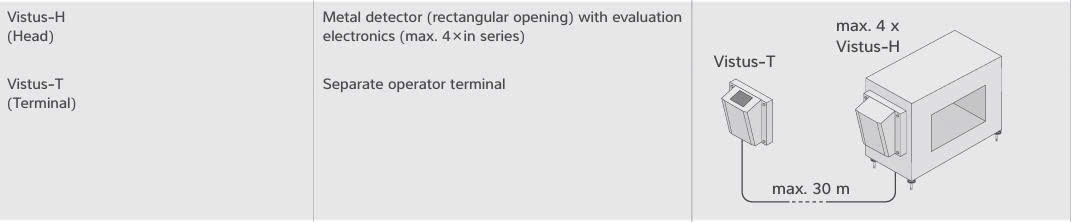 Vistus-H tương thích với các bộ điều khiển như Vistus-T, Vistus-E, Vistus-EI, cho phép linh hoạt bố trí màn hình vận hành và bộ xử lý điện tử. Thiết bị hỗ trợ nhiều kích thước cửa dò khác nhau, đáp ứng đa dạng sản phẩm và tốc độ băng tải.