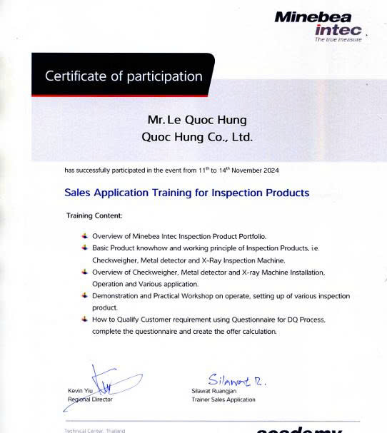 Công Ty TNHH Quốc Hùng vừa hoàn thành khóa đào tạo chuyên sâu từ Minebea Intec về các thiết bị quan trọng trong dây chuyền sản xuất công nghiệp: cân kiểm tra, máy dò kim loại và máy X-ray.